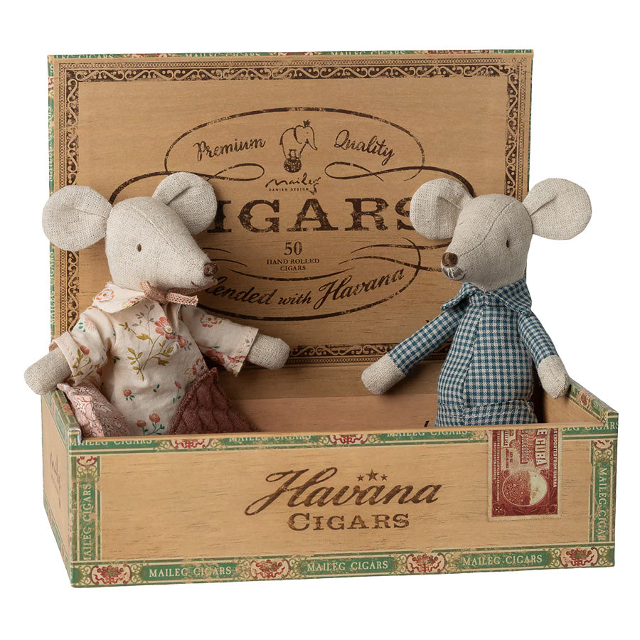Oma und Opa Maus in Zigarrenkiste von Maileg – ein nostalgisches Großelternpaar mit Schlafanzug und Bett in einer schönen Vintage-Schachtel, perfekt für fantasievolles Rollenspiel.