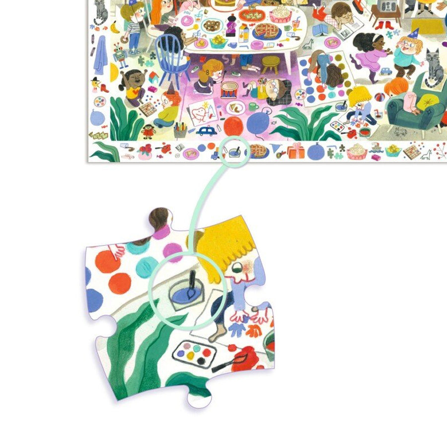 Puslespil og observationsleg: Djeco Observationspuslespil med Fødselsdag er både et puslespil og en lille find-leg. Når motivet er samlet, kan børn lede efter de elementer, der er vist i kanten, og finde dem i den store fødselsdagsscene.