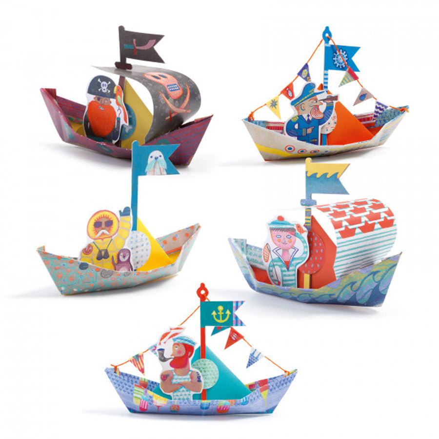 Erstelle eine ganze Flotte gemusterter Papierboote mit diesem hübschen Origami-Set von Djeco. Enthält Papier, Fähnchen und kleine Figuren für das fertige Spiel.