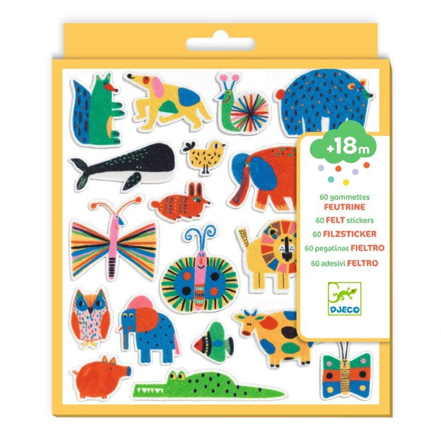 Djeco Filz-Sticker mit Tieren sind 60 weiche Filzaufkleber, perfekt für kleine Hände ab 18 Monaten – ein spielerischer und einfacher Einstieg ins kreative Spiel.