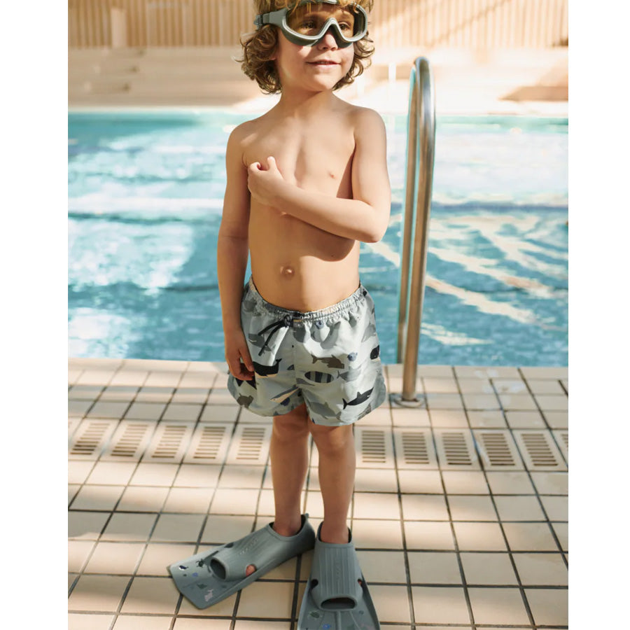 Klassiske Liewood Gustav Svømmefødder med Sea Print i 100 % silikone. Giver ekstra fremdrift i vandet og gør svømmeturen endnu sjovere for børn.
