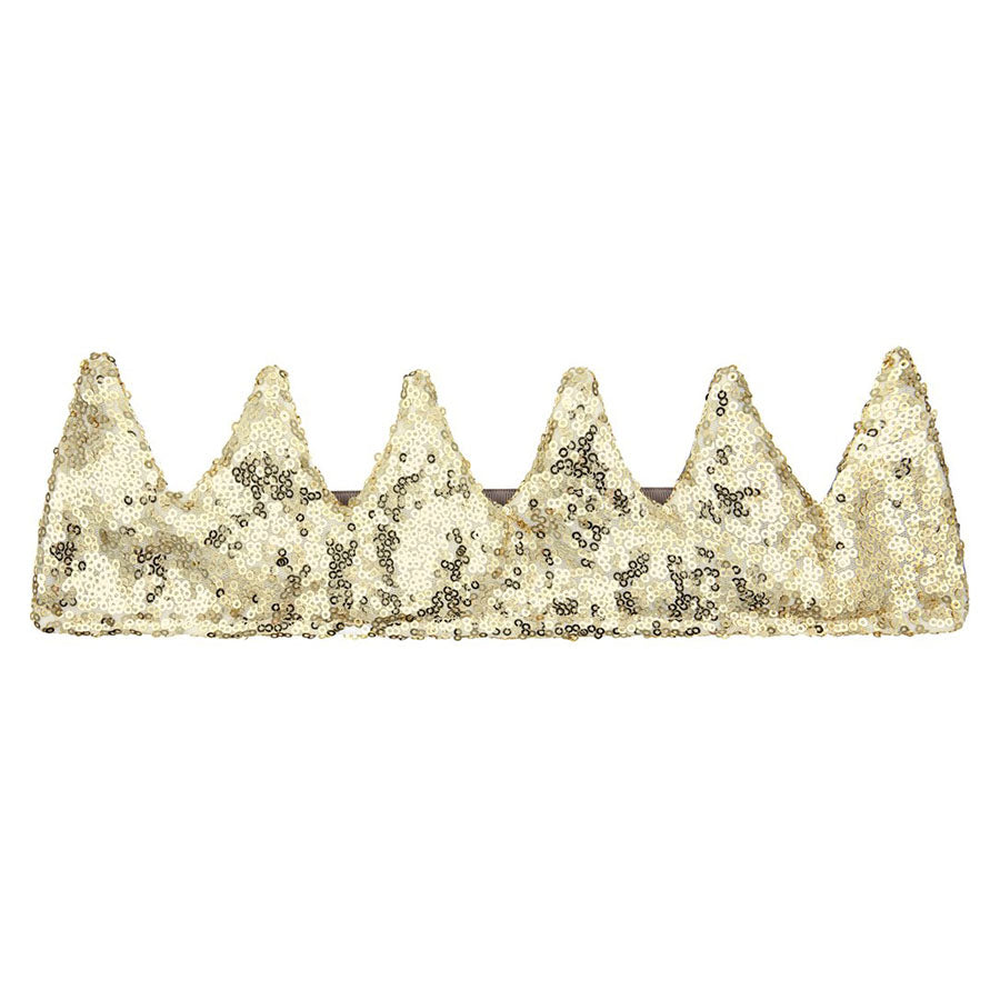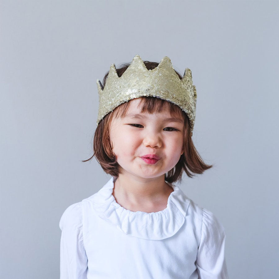 Eine funkelnde goldene Krone mit vielen Pailletten – bereit für kleine Könige und Königinnen.