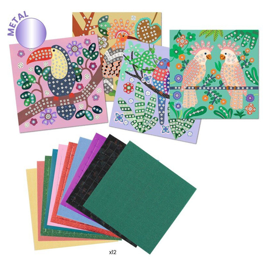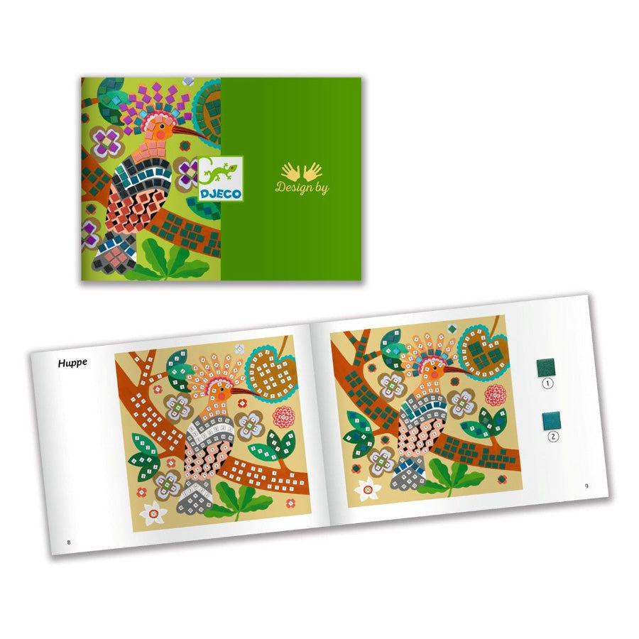 Mosaik mit Vögeln im Dschungel ist eine kreative Aktivität, bei der Kinder Schritt für Schritt bunte Bilder mit kleinen, glänzenden Mosaiksteinchen gestalten. Es ist ein ruhiger und befriedigender Prozess, bei dem das Motiv langsam zum Leben erwacht.