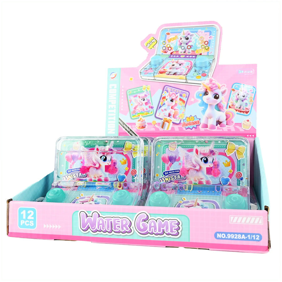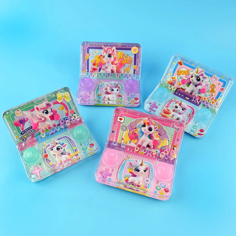 Buntes Wasser-Spiel mit süßem Einhorn – ein klassisches Druckspiel, das sich leicht mitnehmen lässt und perfekt für kleine, spaßige Pausen ist.